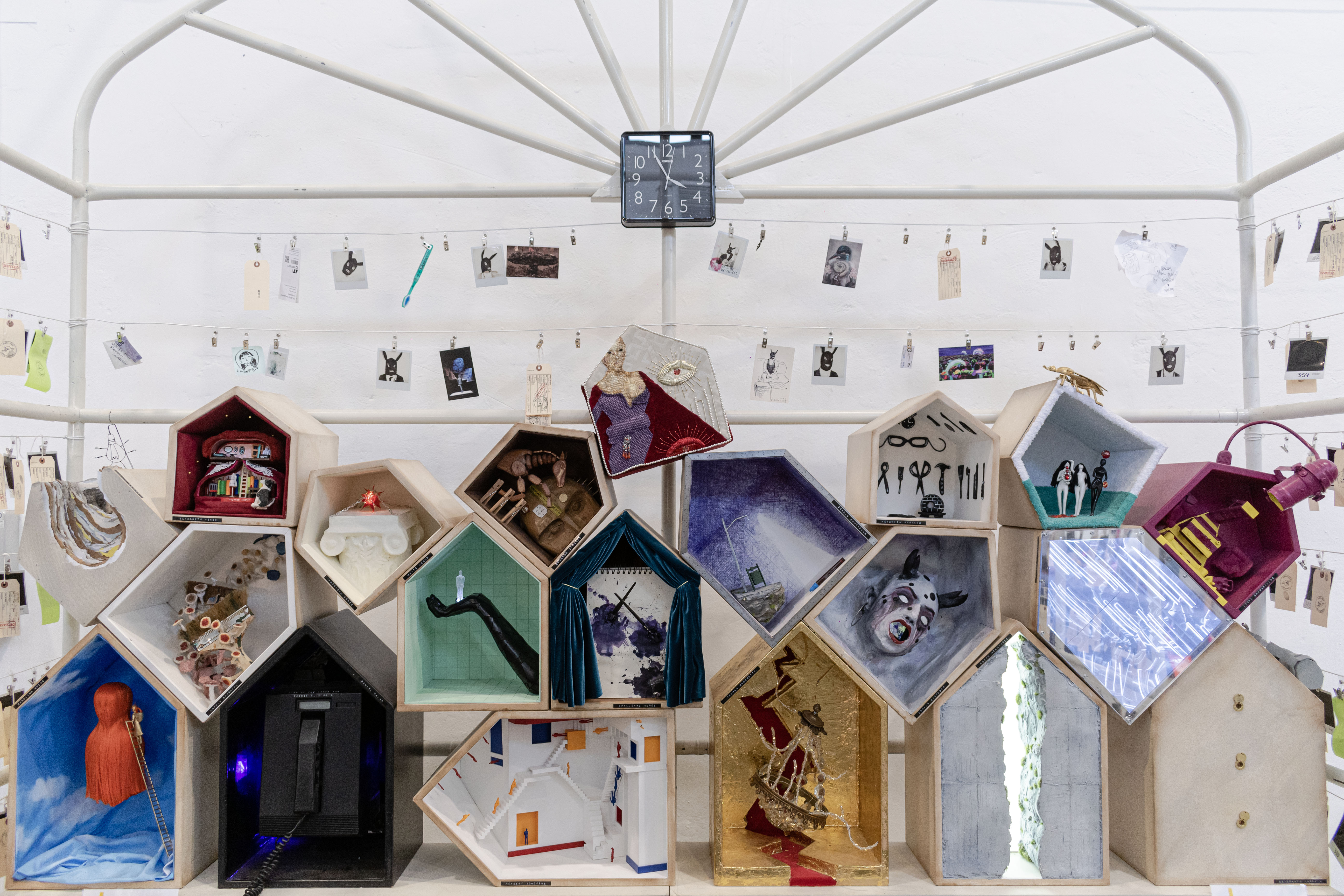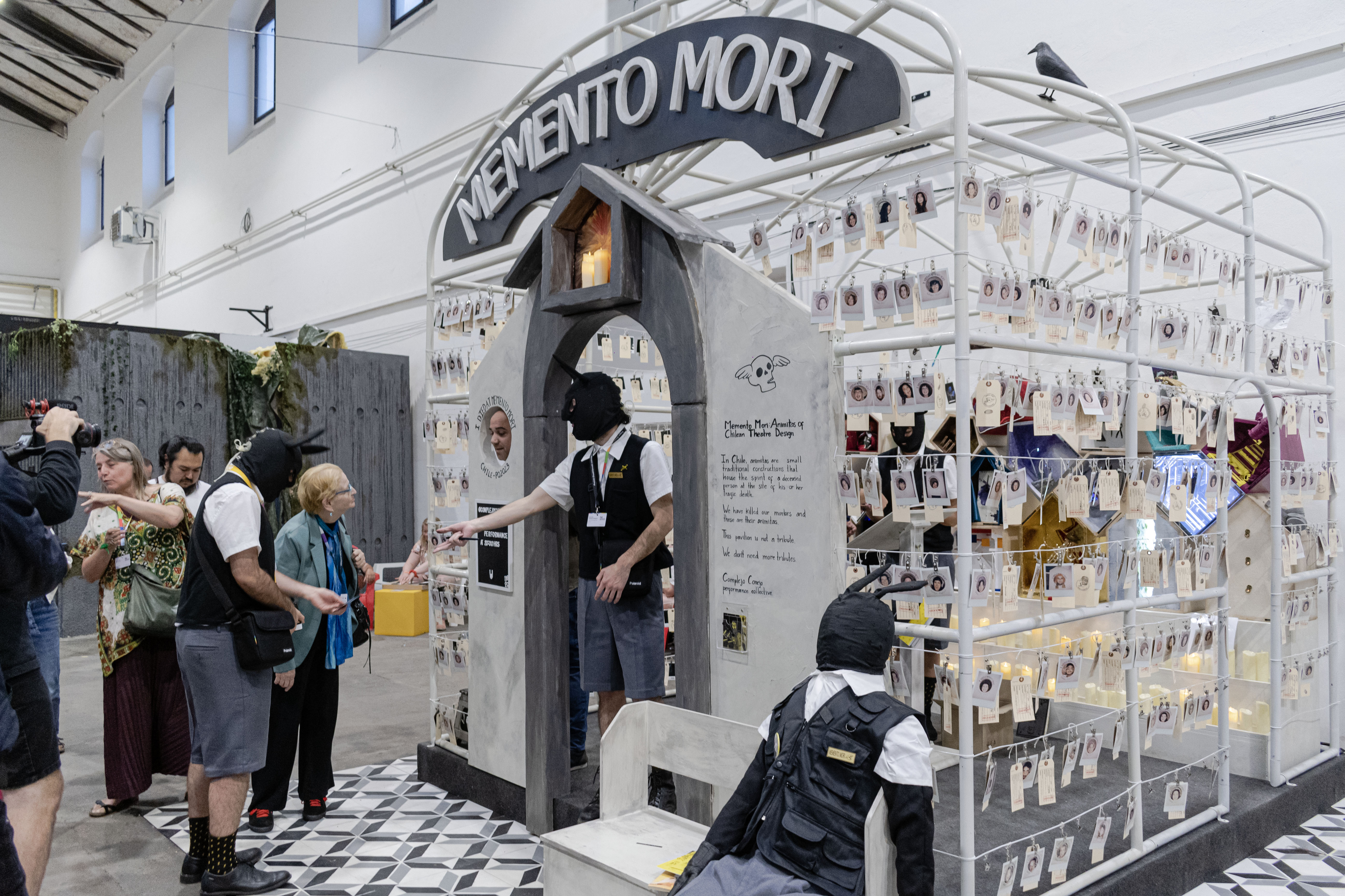 «Memento Mori: animitas of Chilean theater design» is a mise en scène where, like executioners, we have selected and killed twenty of our masters and exhibited their animitas, erecting a mortuary pavilion. So it is that costume designers, transvestites, painters, lighting designers, hairpiece designers, professors, scenographers, and puppeteers, share a place in this pavilion.